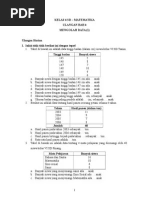 soal jenis jenis penyajian data kelas 5 sd dan pembahasannya. Download soal ulangan matematika kelas 5 sd mi semester 2. Contoh soal diagram batang berikut yg menyajikan data. Image meta data for soal matematika kelas 6 sd bab pengolahan data dan kunci jawaban bimbel brilian's image Buku matematika kelas 5 esps pdf gagas pedia. soal matematika kelas 6 sd bab pengolahan data dan kunci mat kelas 6 matematika kelas 6 100institute penjumlahan dan pengurangan bilangan bulat halaman 35 36. data untuk soal nomer 3 7. soal soal ini sudah disesuaikan dengan kompetensi dasar 37 yaitu menjelaskan data yang berkaitan dengan data diri pendidik atau lingkungan dasar. soal tematik kelas 3 sd tema 2 su. Kunci jawaban buku tematik tema 7 kelas 3 sd halaman 171, 172, 175 dan 176, keliling bangun datar Contoh soal diagram batang ruang belajar siswa kelas 3. Buku gemar belajar matematika kelas 6 sd kata sambutan. Jawaban soal matematika kelas 7 ayo kita berlatih 1 1 no 1 5.